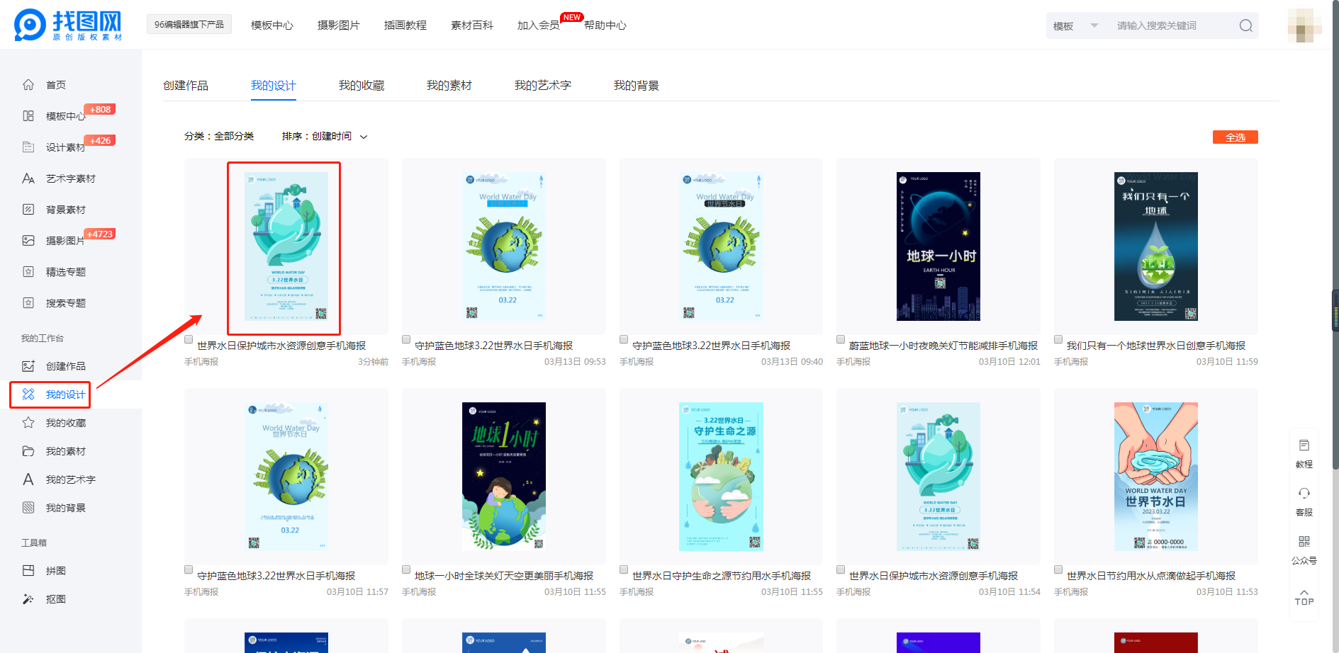 打开找图网,点击【我的设计】,即可看到自己使用过的模板。
