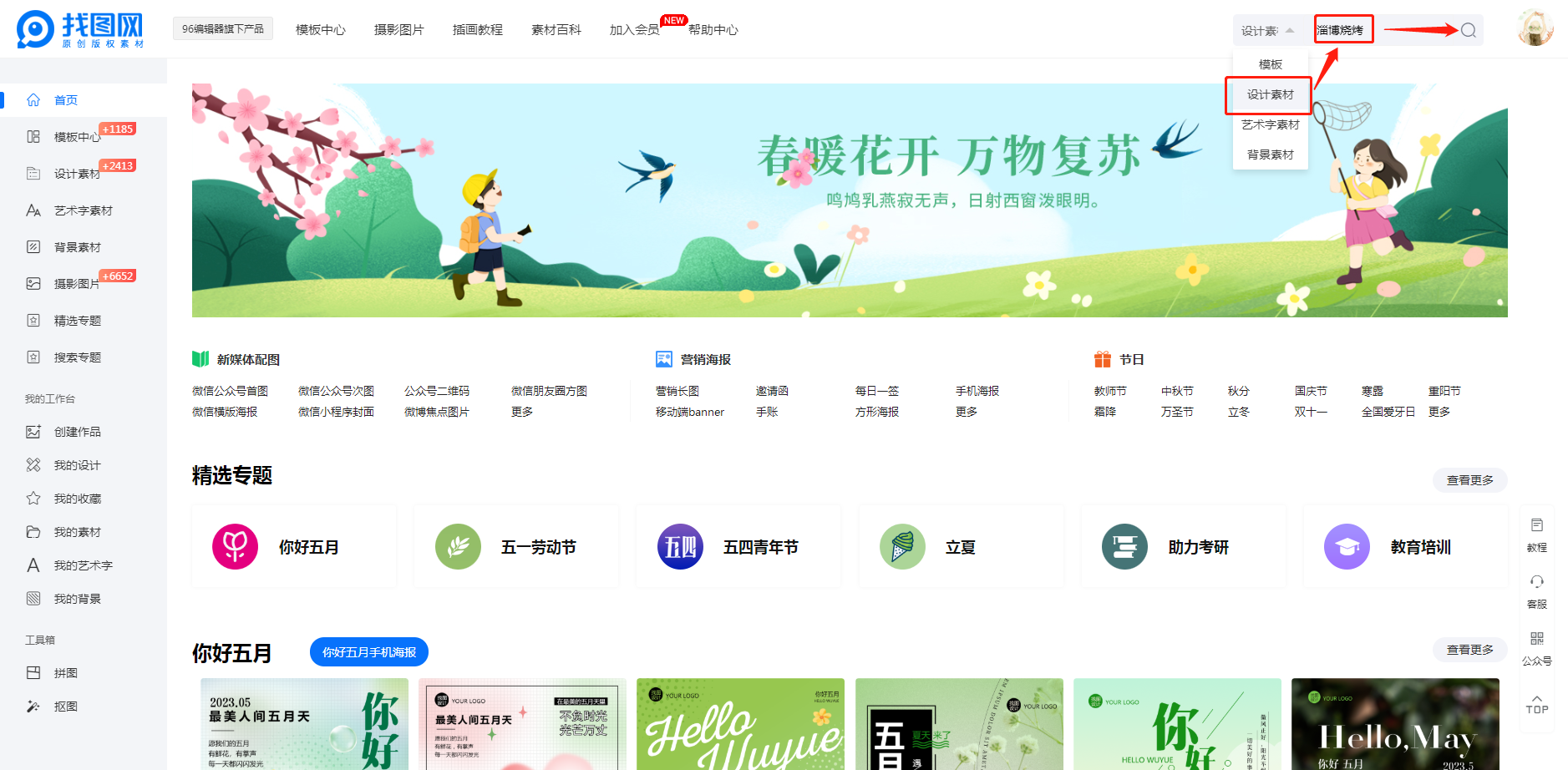 首先,打开找图网官方网站,在网站首页选择【设计素材】,输入关键词“淄博烧烤”后搜索;
