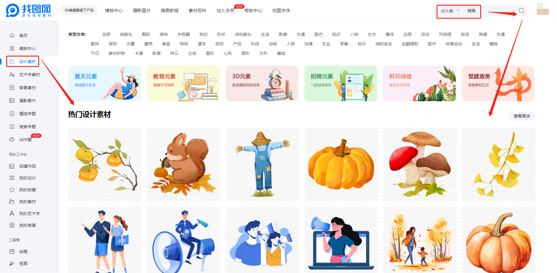 首先,在找图网设计素材频道,搜索想要的素材关键词,例如:线条;