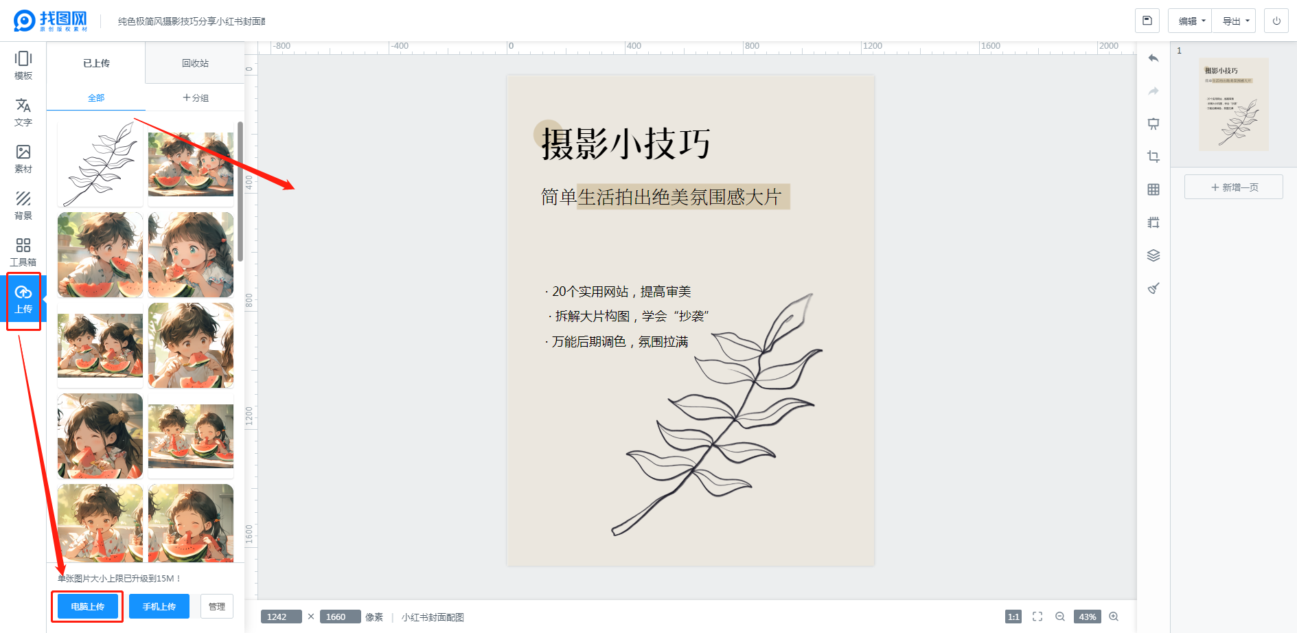 通过以上的简单操作,你也可以轻松的下载并使用高级感的手绘单片叶子插画,在线设计出具有美感的小红书封面。