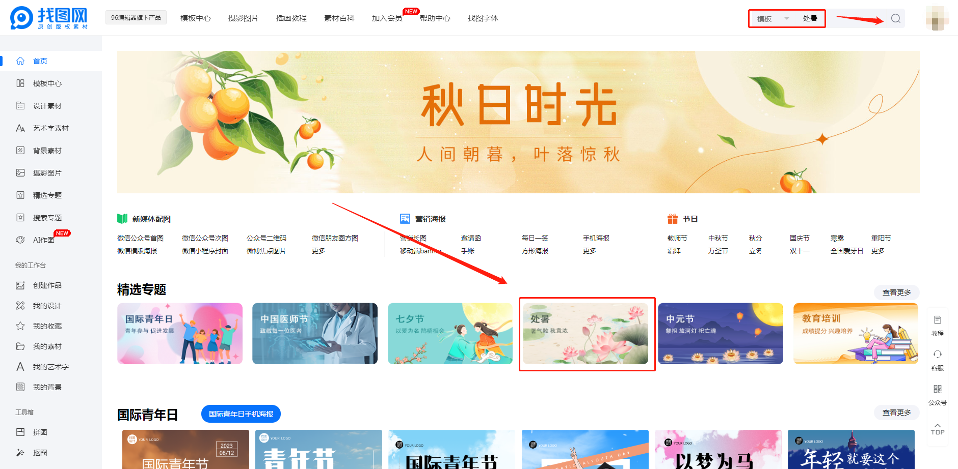 小伙伴们可以在精选专题-处暑频道查看喜欢的模板,也可以在右上角模板内搜索想要的海报关键词,例如:处暑;