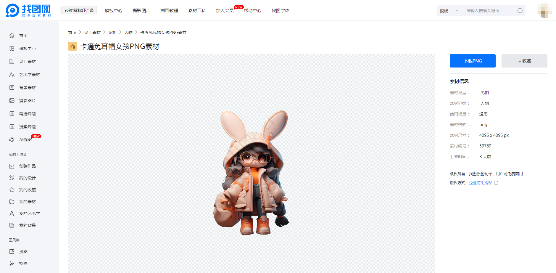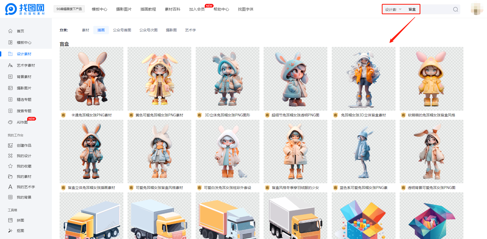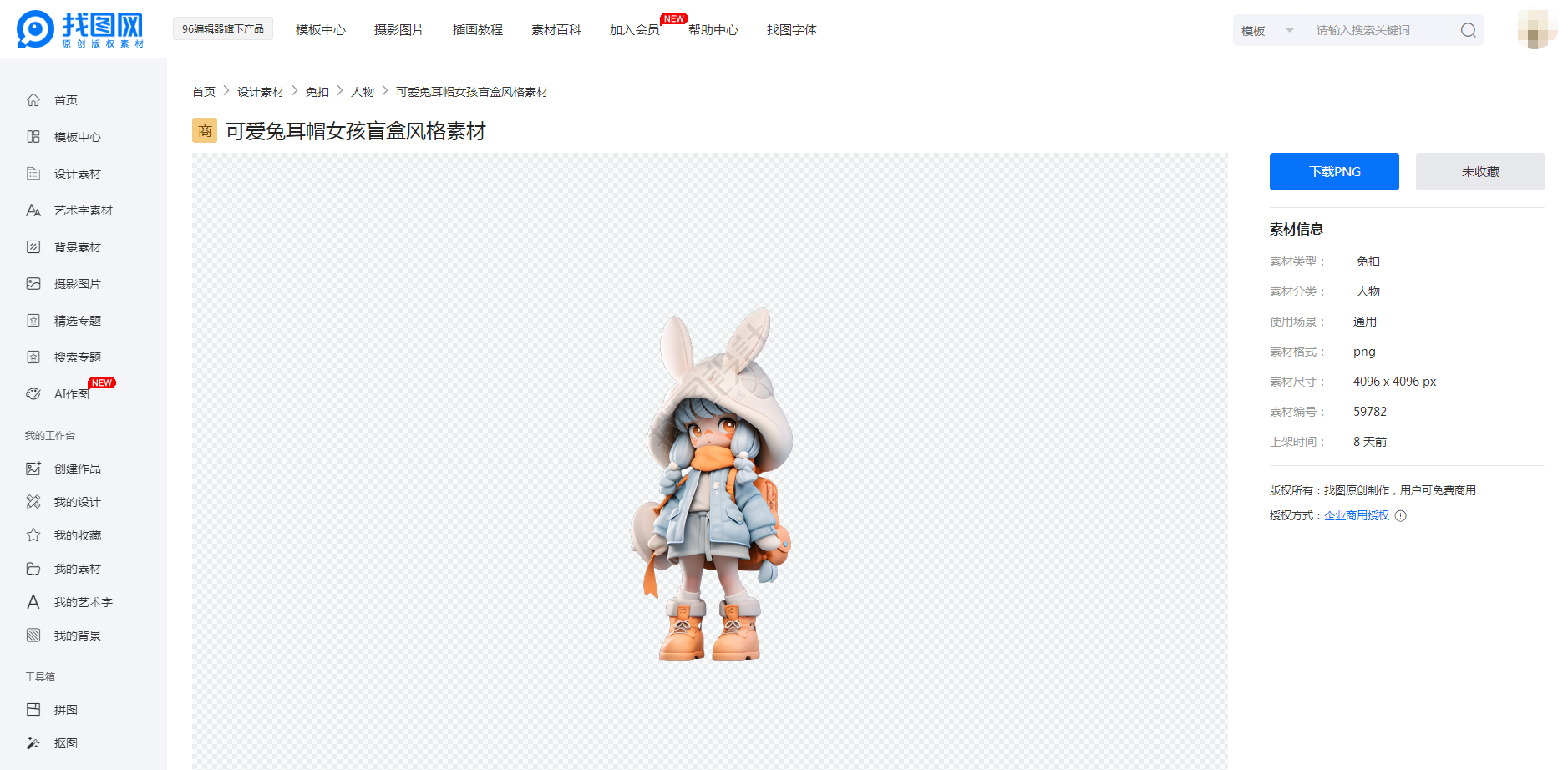 小伙伴们可以在找图网-设计素材内,搜索盲盒、兔儿帽、女孩等关键词找到它哦!