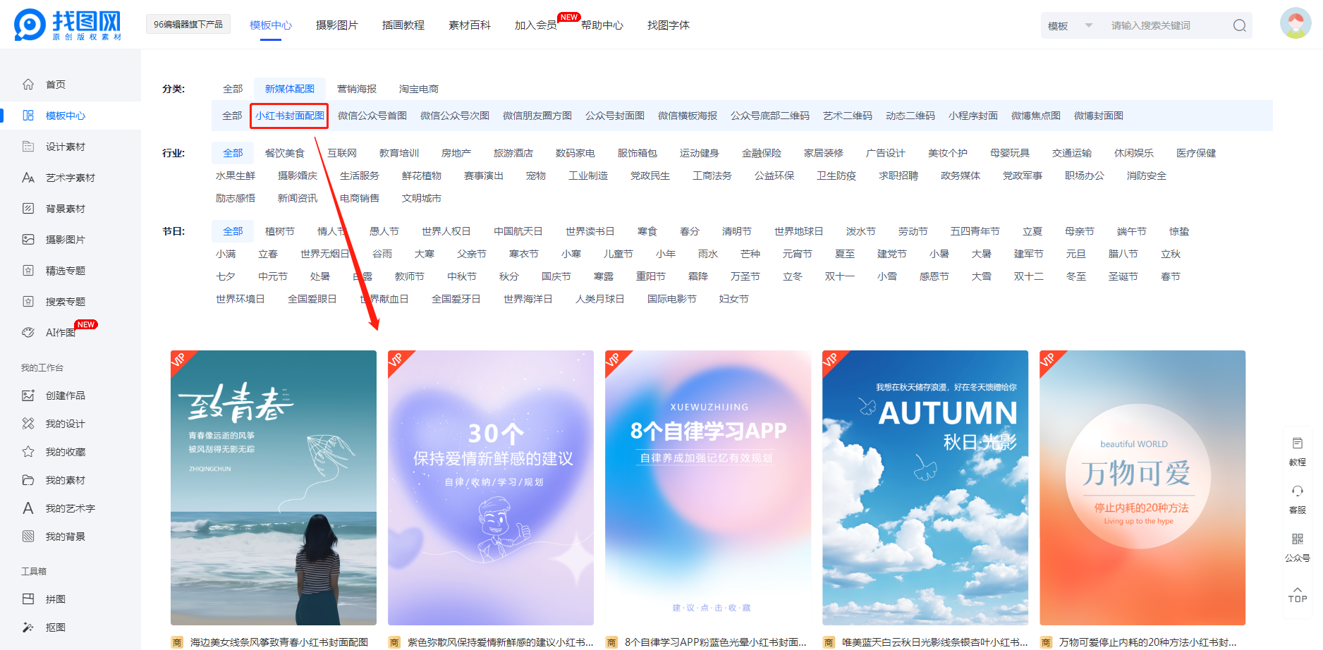 首先,建议小伙伴们在找图网-小红书封面配图内查找符合自己主题的模板并点击使用;