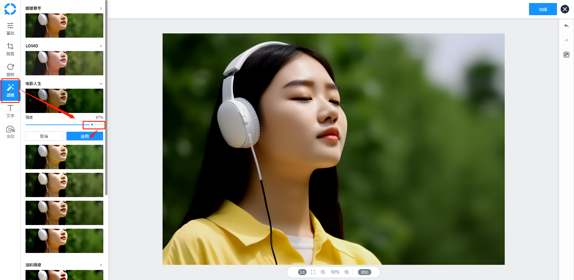 同时,还为小伙伴们提供了各种滤镜效果,例如电影人生、怀旧、单色印象等,选择合适的滤镜,自定义调节强度大小,点击应用即可让图片更加有氛围感。在添加滤镜时,要注意保持图片与小红书封面模板整体风格和色彩相搭配。滤镜只是增加了一些特殊效果,而不应该掩盖模板中的重点内容;