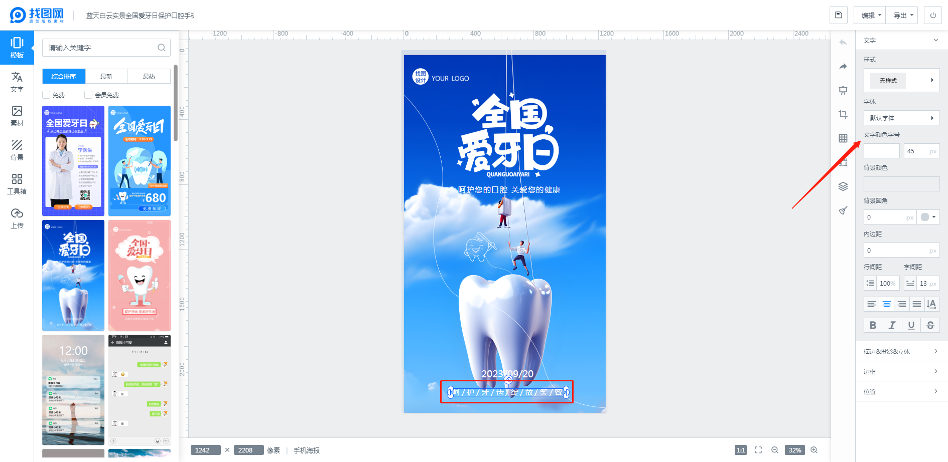 选中文字,可自定义文字内容,颜色、字号、字间距等,为宣传海报增加想要的文字,更好的宣传口腔健康的重要性;