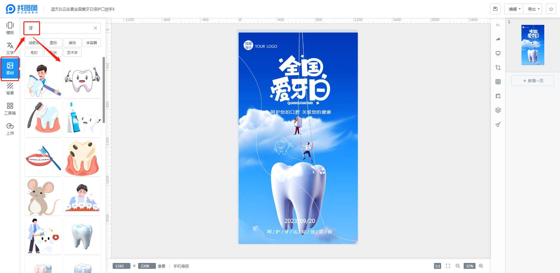 点击素材,搜索牙齿、牙、爱牙日等关键词,即可为海报添加相关的元素插画,增加海报的趣味性;