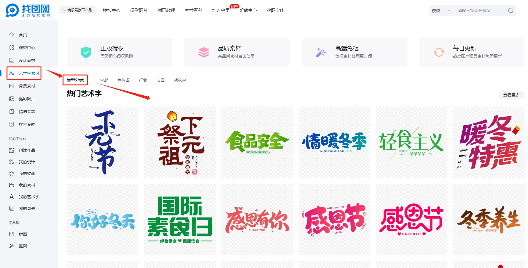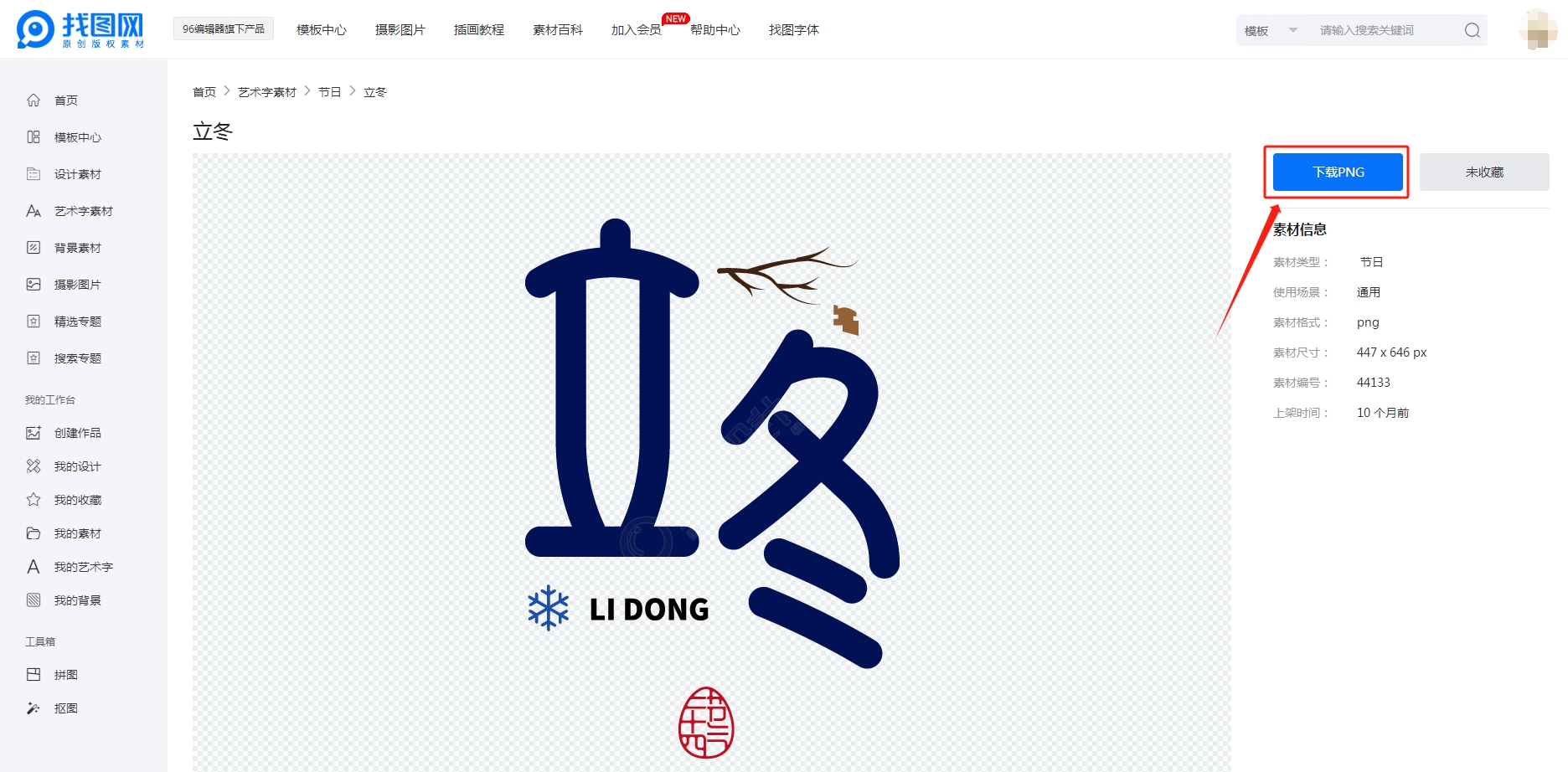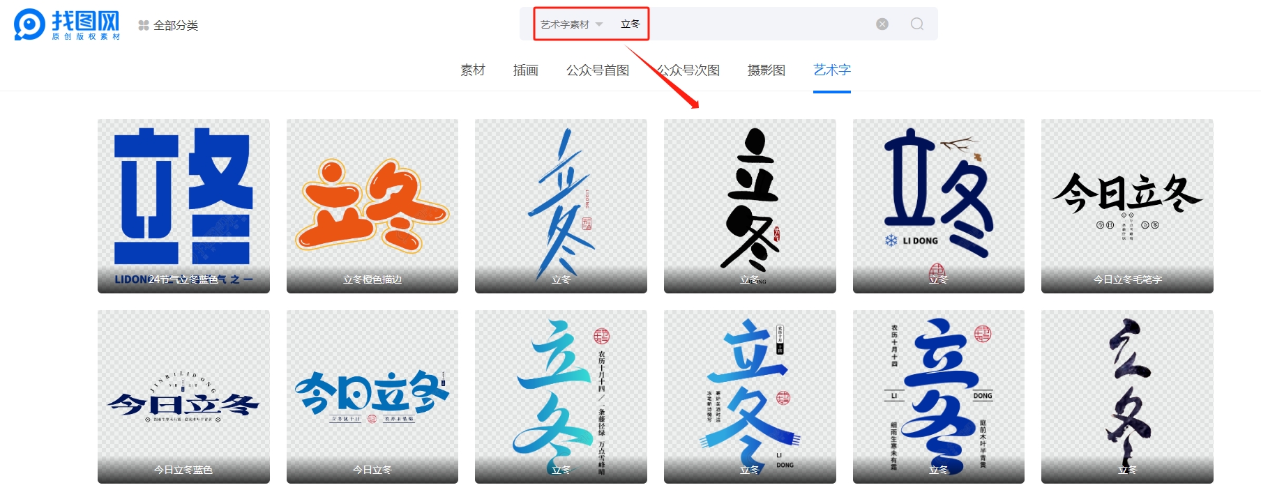 其次,在找图网右上角艺术字素材下,搜索想要的艺术字关键词,例如:立冬,即可快速准确的搜索到相关的艺术字;
