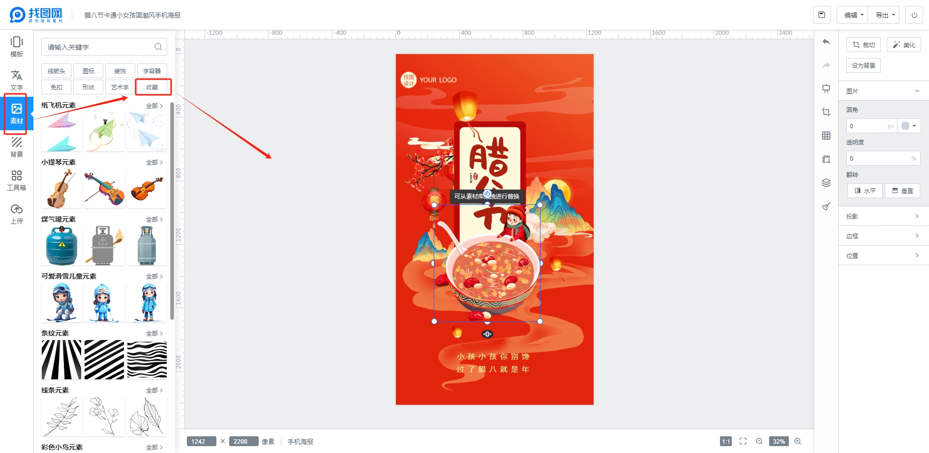 小技巧:点击收藏,然后在找图网模板编辑页面,点击素材-收藏,就可以直接找到自己收藏的插画使用啦!