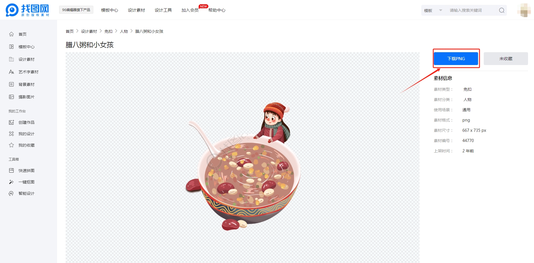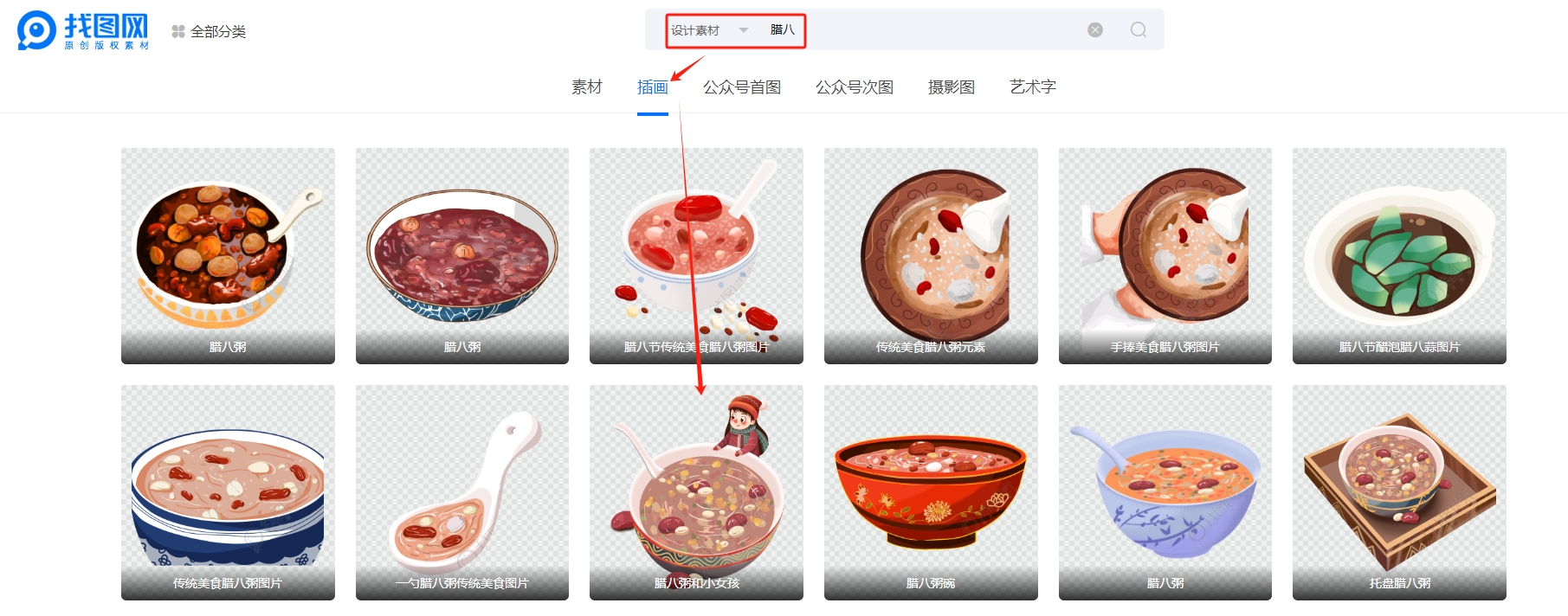 首先,在找图网首页-设计素材内,搜索想要的插画关键词,例如:腊八、腊八节、腊八粥等;