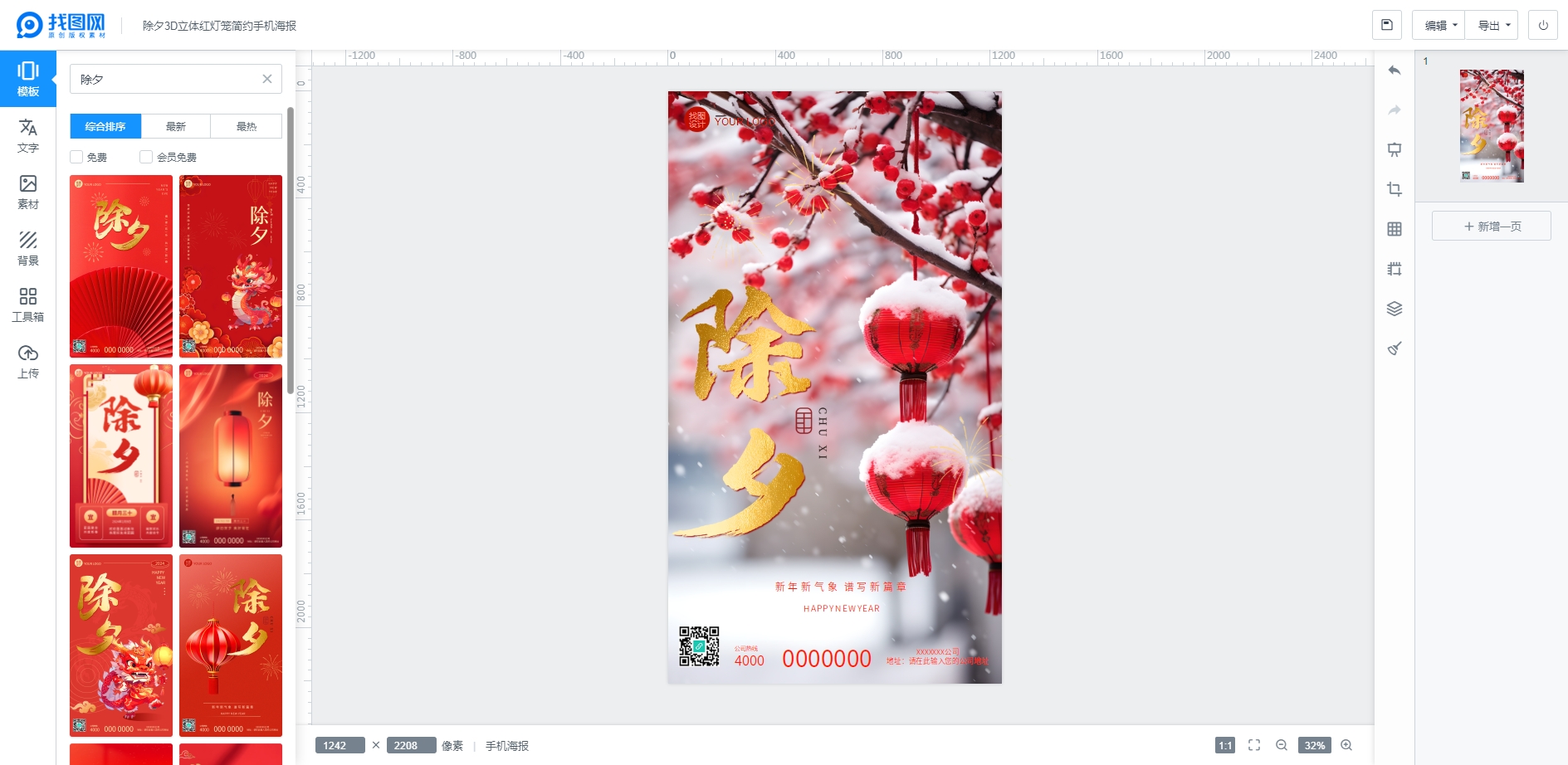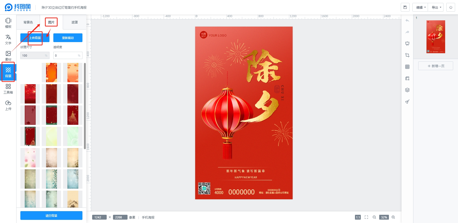 在模板编辑页面,点击背景-图片-上传背景,即可将刚下载的红灯笼高清图设置为海报的背景图;