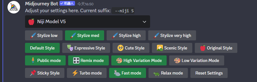 首先打开Midjourney,在对话框里输入“/settings“发出,弹出了设置的对话,将模式切换到【Niji Model V5】(也可在后续关键词末尾自行添加命令”--niji 5“)