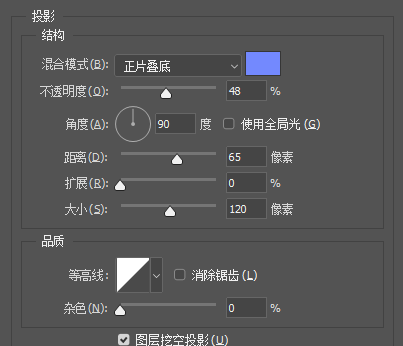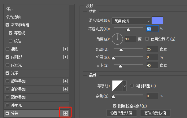 4. 添加投影效果,调整参数,点击加号再添加一层投影